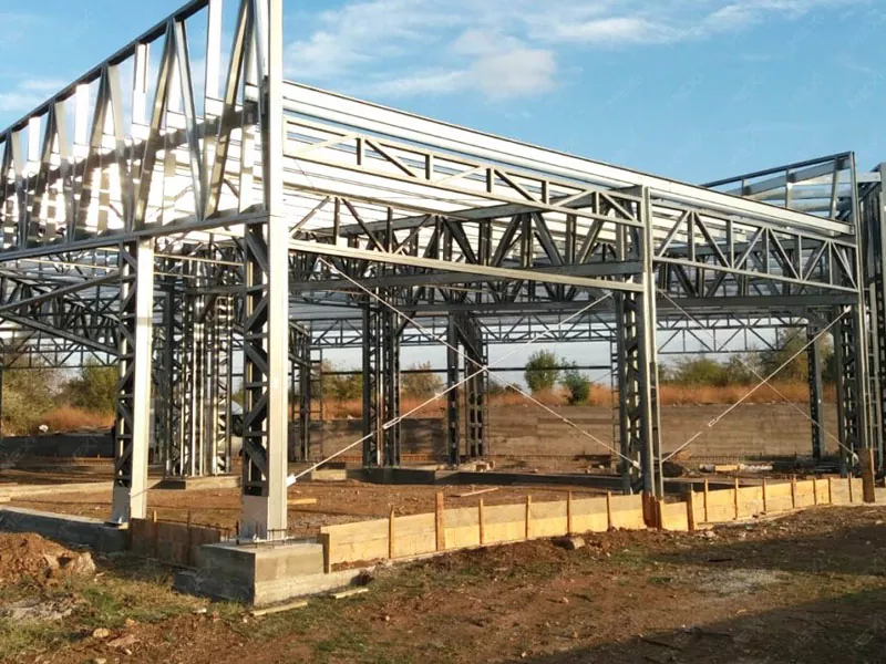 4. எஃகு கட்டமைப்பு நிறுவல் முன் தயாரிக்கப்பட்ட எஃகு கூறுகள் கட்டுமான தளத்திற்கு கொண்டு செல்லப்பட்டு கிரேன்கள் மற்றும் பிற கனரக உபகரணங்களைப் பயன்படுத்தி ஒன்றுசேர்க்கப்படுகின்றன. நிறுவல் செயல்முறையானது அடித்தளத்திற்கு நெடுவரிசைகளை நிறுவுதல் மற்றும் நங்கூரம் செய்வதன் மூலம் தொடங்குகிறது, அதைத் தொடர்ந்து கிடங்கு சட்டத்தை உருவாக்க பீம்களை நிறுவுகிறது. கூரை அமைப்புக்கு ஆதரவாக கூரை டிரஸ்கள் பாதுகாக்கப்படுகின்றன.